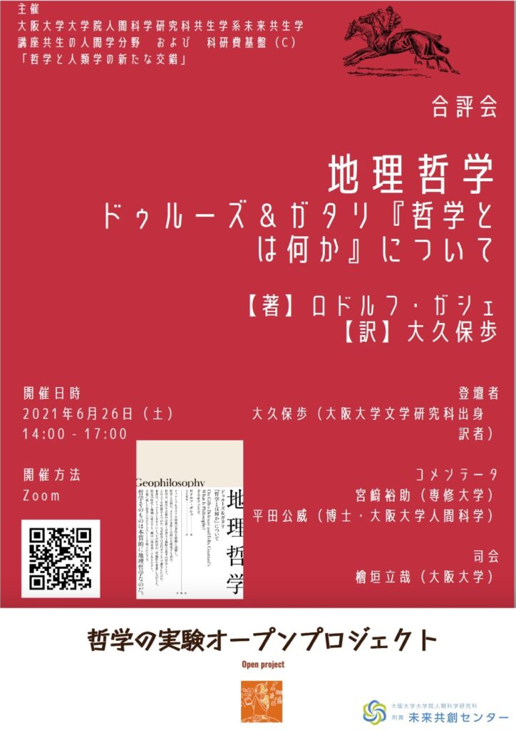 TOP > Activity Report > 合評会 地理哲学 ドゥルーズ&ガタリ『哲学とは何か』について 2021/6/26 LAB公式イベント合評会 合評会 地理哲学 ドゥルーズ&ガタリ『哲学とは何か』について 2021年6月26日に実施された哲学の実験オープンラボのイベントです。哲学の実験オープンラボの檜垣立哉教授が司会をなされました。
